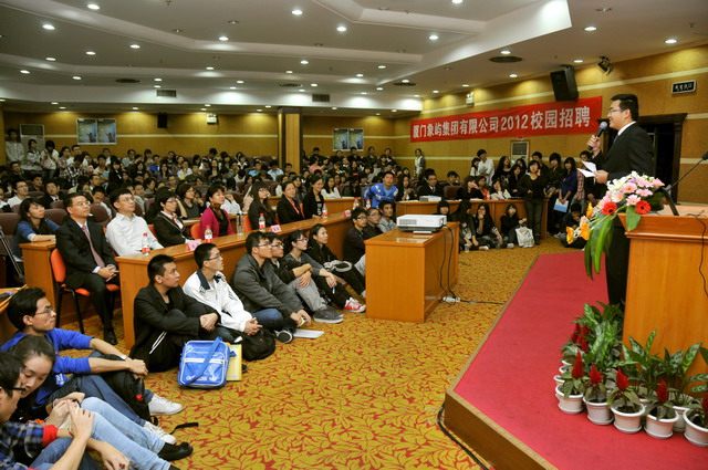 2012年象嶼集團全國校園招聘首場宣講會于11月23日晚在廈門大學拉開帷幕。集團人力資源總監(jiān)林志勇、象嶼股份人力資源部經(jīng)理林焱為同學們進行了精彩的宣講并回答了同學們現(xiàn)場的提問,鼓勵廈大的優(yōu)秀學子們加入到象嶼的大家庭。據(jù)悉,此次宣講會吸引了近500位應屆生參加,場面火爆,提問環(huán)節(jié)積極踴躍,會后現(xiàn)場收到簡歷近500 份。
