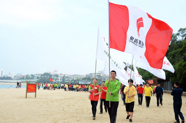 活動(dòng)啟動(dòng)儀式上,集團(tuán)公司黨委副書(shū)記、工會(huì)主席陳偉彬代表集團(tuán)領(lǐng)導(dǎo)班子向共建單位代表及全體員工致以節(jié)日的問(wèn)候!陳副書(shū)記表示,我們要尊重勞動(dòng)、謳歌勞動(dòng)者;我們要倡導(dǎo)運(yùn)動(dòng),褒獎(jiǎng)優(yōu)勝者;我們崇尚遠(yuǎn)大的理想,憧憬美好的未來(lái)。海軍南方局李躍峰副政委對(duì)象嶼集團(tuán)在勇?lián)鐣?huì)責(zé)任、傳承愛(ài)心善行方面所作的努力高度贊揚(yáng),并表示這對(duì)深入培育當(dāng)代革命軍人核心價(jià)值觀(guān)方面具有十分積極的推動(dòng)促進(jìn)作用。隨后進(jìn)行了“象嶼集團(tuán)縱走俱樂(lè)部”授旗儀式,集團(tuán)總裁張水利為縱走俱樂(lè)部授旗,號(hào)召更多縱走愛(ài)好者“走在一起,樂(lè)在一起”!集團(tuán)及海軍南方局領(lǐng)導(dǎo)、十佳員工及志愿者代表鳴槍發(fā)令,全體人員在司旗的帶領(lǐng)下,向著音樂(lè)廣場(chǎng)出發(fā)了!