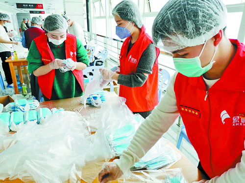 象嶼黨員志愿者協(xié)助夏商集團(tuán)分裝口罩。