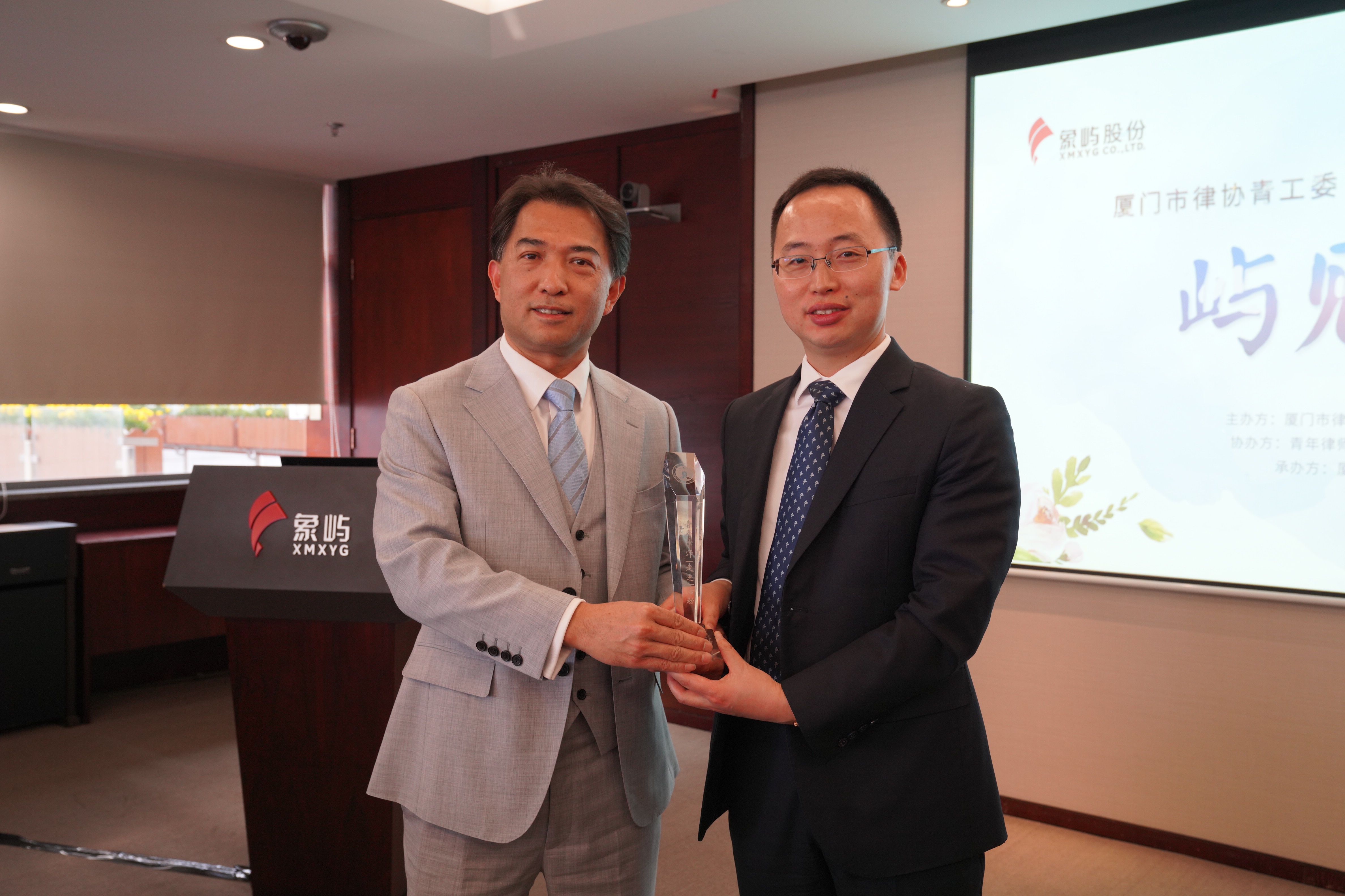 陳水湖主任代表市律協(xié)青工委向范承揚(yáng)副總經(jīng)理贈(zèng)送青年律師“走進(jìn)”活動(dòng)紀(jì)念獎(jiǎng)杯