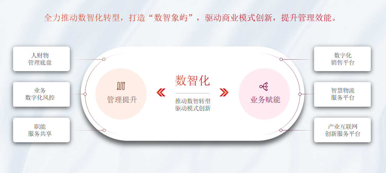 象嶼股份依托海量的業(yè)務(wù)數(shù)據(jù)、龐大的客戶資源、豐富的應(yīng)用場景,積極推進數(shù)字化技術(shù)與業(yè)務(wù)的有效融合,并已落地農(nóng)業(yè)產(chǎn)業(yè)級互聯(lián)網(wǎng)平臺、供應(yīng)鏈金融服務(wù)平臺、智慧物流服務(wù)平臺、網(wǎng)絡(luò)貨運平臺4大重點項目,實現(xiàn)技術(shù)及商業(yè)模式升級。